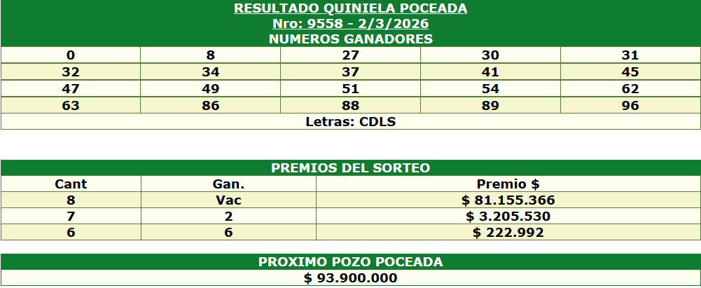 Publicamos los números ganadores apenas se realiza el sorteo, para que verifiques tu jugada de manera rápida y segura. La Poceada es una de las loterías más populares del país, ofreciendo premios emocionantes cada semana. En Ruta1000 también encontrarás resultados anteriores y estadísticas útiles para seguir el juego de cerca. Ingresa ahora y descubre en directo los resultados de la Poceada de hoy. ¡Mira si tus números fueron premiados en Ruta1000!