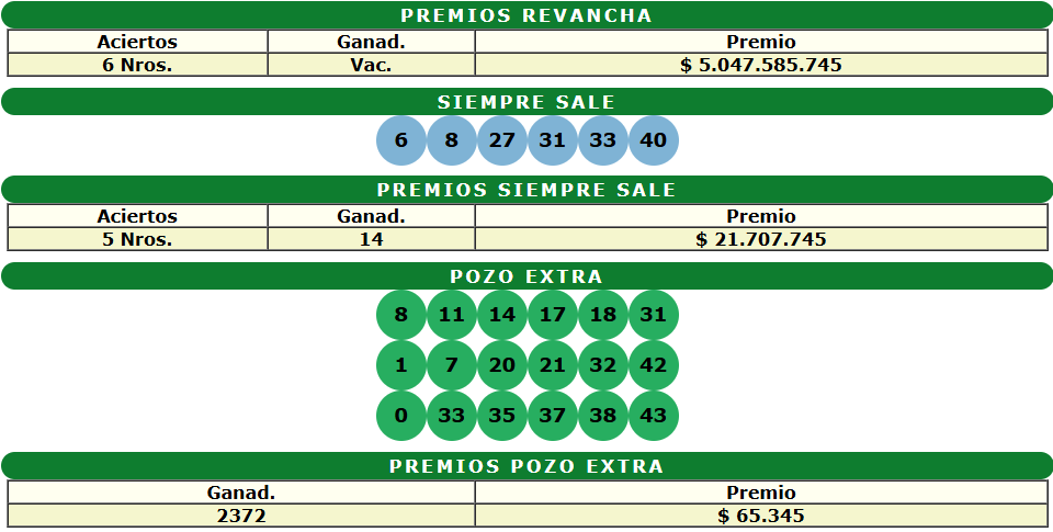 • Premio mayor (6 aciertos) → Puede superar los 1.000 millones de pesos.